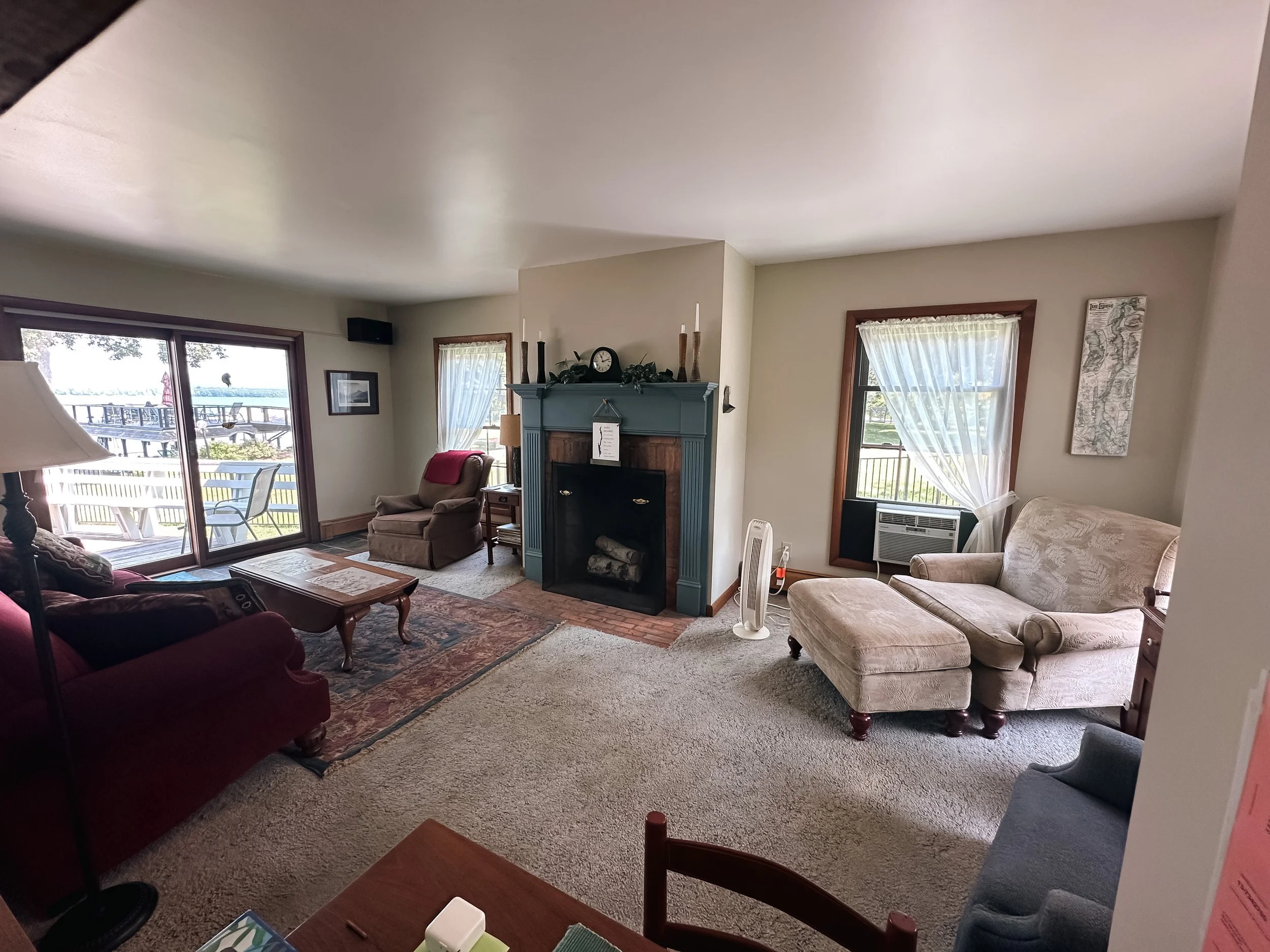 The cozy living room features a fireplace, comfortable seating, and large windows showcasing views of Lake George. A window A/C unit in the living room helps keep the space cool during warmer months. The open dining area is perfect for family meals or game nights, while the fully equipped kitchen includes a full suite of appliances—refrigerator, stove, oven, microwave, dishwasher—as well as a coffee maker, toaster, cookware, and dishes. The master bedroom also includes a window A/C unit, providing added comfort for summer stays. Upstairs, a dedicated recreation room includes a TV, DVD player, and video game-ready setup—an ideal space for kids or teens to unwind.